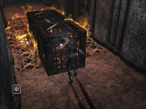 Now the intermittent flames below the grates are off. So you don't need the cages to cross as long as you jump carefully over the areas with burning coals. Note that Lara will jump farther and higher with pistols drawn.