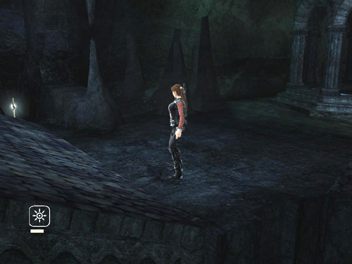 Alternatively, swing from the chain to the alcove on the left wall. Climb to the right and drop to grab the niche below. Climb to the right again and then drop down to the next niche. Note that the sills of these small niches start to break away when Lara grabs them, so you must move quickly. Position Lara near the middle of the lowest alcove and then jump back to land on the broken stairs. Before they collapse, run down and jump to the solid landing in the corner.
