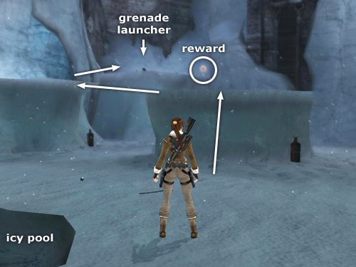 Then climb onto the other snow plateau and take a running jump to grab the projecting ice ledge ahead; pull up. (screenshot) Jump from the right side of this ledge to the ledge where the guy with the GRENADE LAUNCHER was. Take his weapon if you want, but you may be better off with the rifle since more ammo is available. Pick up another bronze reward (6/9).