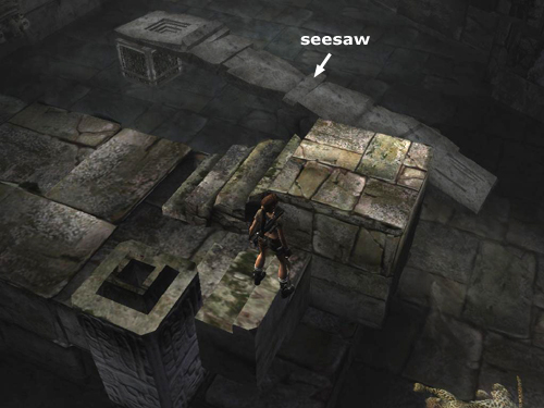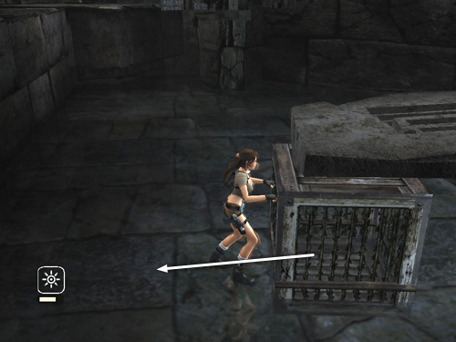 The way out is on the high ledge at the far end of the room. To open it you must activate the 3 square pressure pads on the long ledge near the entrance. The left and right pads control the huge gears on each side wall. The center pad actually raises the door. All three pads must be depressed at the same time for the mechanism to work. You'll need 2 of the 3 movable cages. Lara will press the third pad. This sequence is also shown in a gameplay video.