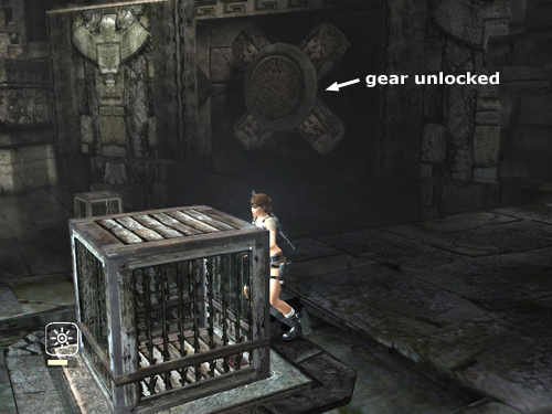 Then stand on the remaining pad. A brief cut scene shows the gear on the left wall unlocking and the exit opening.