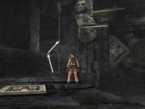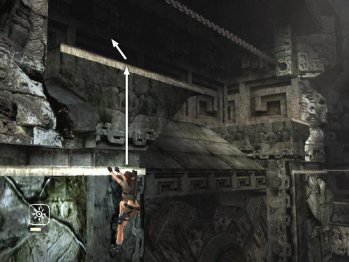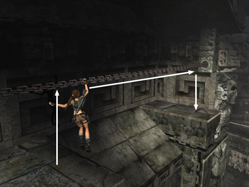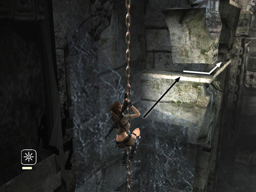 Climb the chain and jump to grab the handhold ahead. (Here it may help to move the camera behind Lara and then jump forward.) Traverse around the corner to the right.