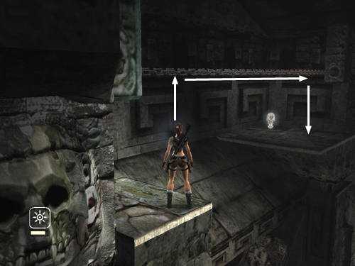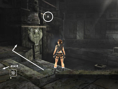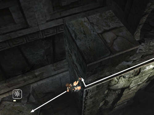 . . . and around the corner. Once Lara is hanging with her back toward the ledge near the exit, lean back and jump to land there.