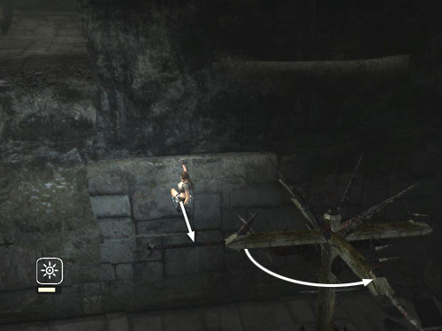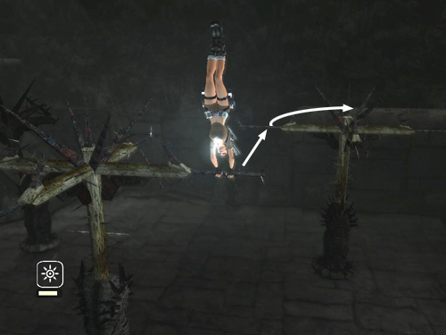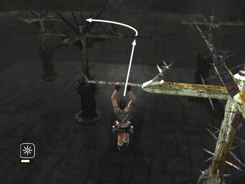 Stand on the raised area in the corner of the room with the alcove containing the silver reward behind Lara to the right and the entrance and tunnel ahead on her left, as shown above. Face the left horizontal "arm" of the rack straight ahead and take a running jump to grab it.