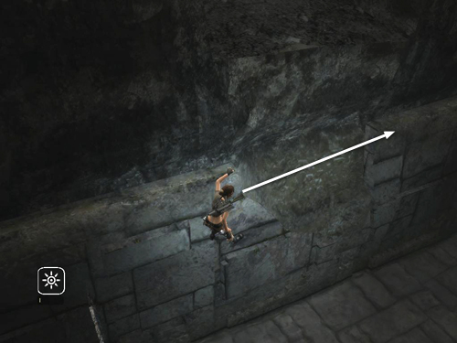 Climb to the right a little more until the grabbable arm of the nearest coat rack is directly behind Lara, as shown above. Lean away from the wall and jump to grab onto the rack. Release the direction controls and let the rack pivot toward the alcove with the reward.