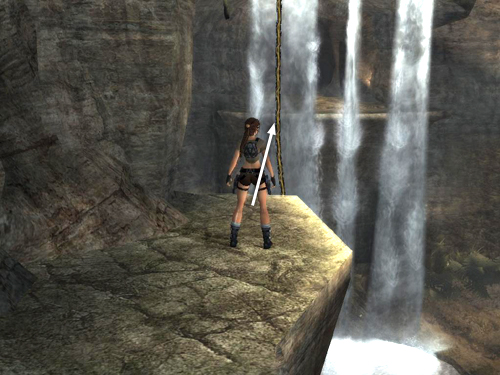 While hanging from the vine, turn left to face the cave between the ledge where Lara was just standing and the waterfall. Swing toward the cave and Jump to leap off the vine into the cave. (The in-game instructions explain how the keys work. Check your booklet or the Controls page for more info.)