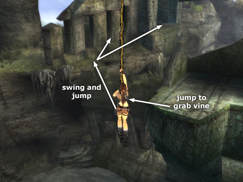Climb to the bottom of the vine for the longest possible swing. Turn to face the square pillars and aim for the second opening from the left. Swing as high as possible and jump to land on the narrow, uneven ledge just below the square pillars. Then either run to the right along the ledge and jump onto the broken bridge, or climb through the third opening from the left, and the mercenary will not appear. If you go through the first or second opening, you will meet the mercenary.