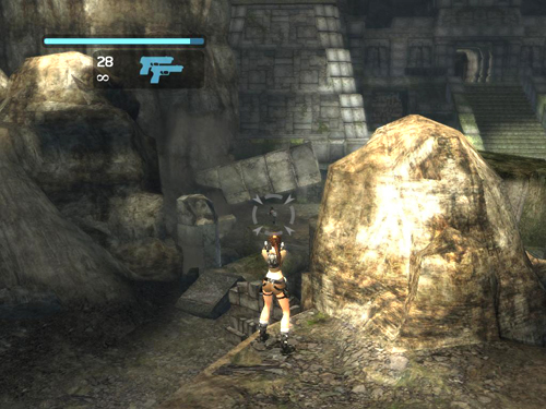 If Lara is close enough, you should also see the Interact icon on the tall, gray pillar indicating that it is another environmental hazard. If not, inch forward a bit until the icon is visible. Wait until one of the soldiers is standing beneath the pillar and then press Interact to fire.