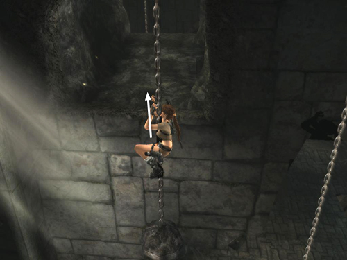 NOTE: It really doesn't matter which way Lara is facing when you jump as long as the camera is pointed where you want her to go. But centering the camera behind her makes it easier to aim for the chain.