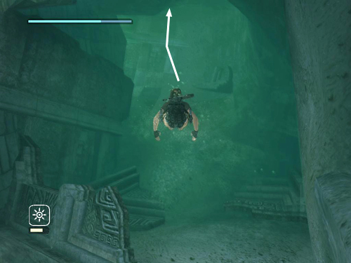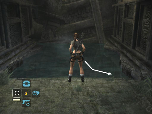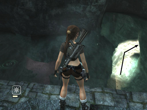 If you look back into the water from this ledge, you'll see the tunnel you came from on the left. It's dimly lit and sort of purple. Jump into the water and swim down through the brightly lit tunnel on the right. Surface and climb out of the water near CHECKPOINT 11.
