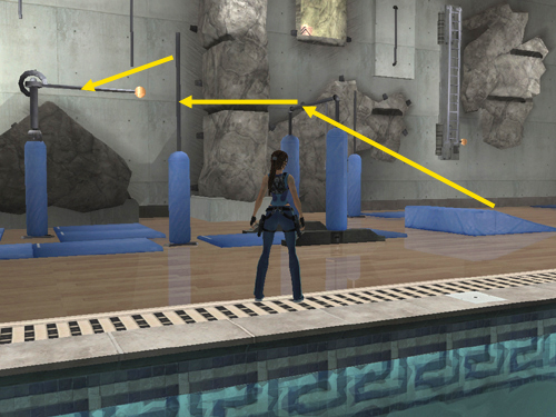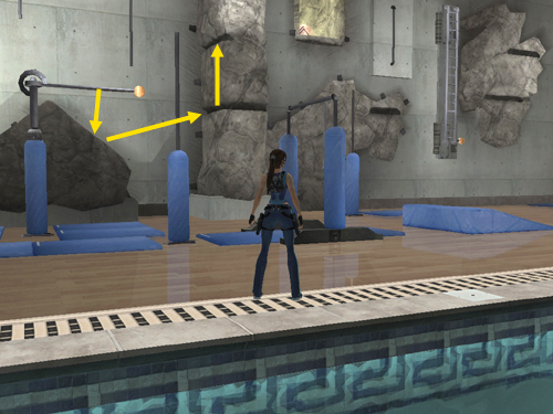 Adjust Lara's left-right positioning if necessary and jump back to grab the vertical pole hanging from the ceiling.