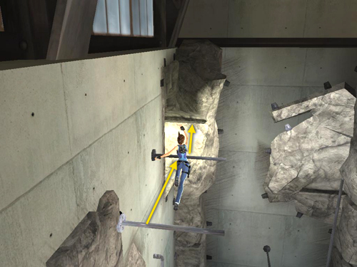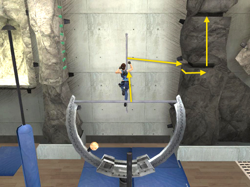 Swing around and jump to grab the second horizontal pole. Swing and jump from the second pole to grab the crevice in the corner rock formation.