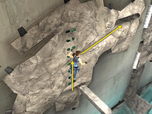 Again climb around to the right. Drop onto the slope, and before Lara can slide off, quickly press Jump (no need to jump in a particular direction). . .