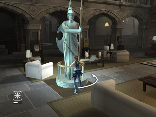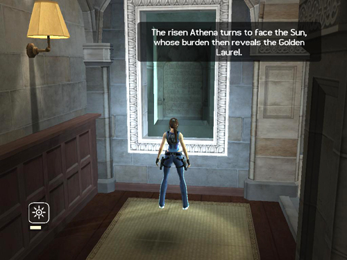 The switch panels also rotate again, revealing a set of carved plaques with another clue. Again, press Interact to make Lara read it aloud: "The risen Athena turns to face the sun, whose burden then reveals the golden laurel."