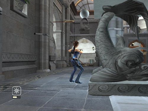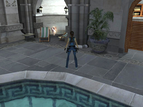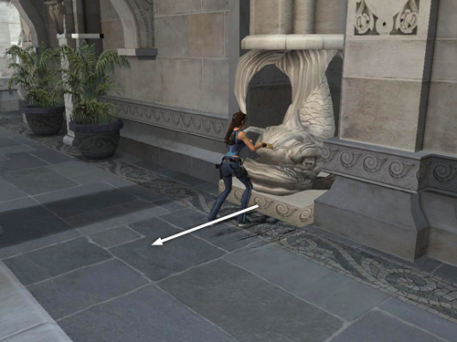 From the entrance to the swimming pool room, make your way forward along the right wall. Note the carved, fish-shaped pillars with handles. These move. Pull the first one out from the wall.