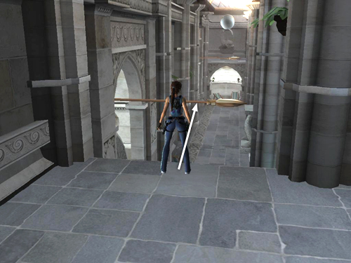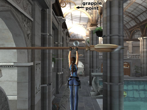 Turn to face the pool and then move to the left side of the balcony. If you haven't done so already, use the magnetic grapple to extend the spears held by the statues along the left wall. Take a running jump to grab the first spear.