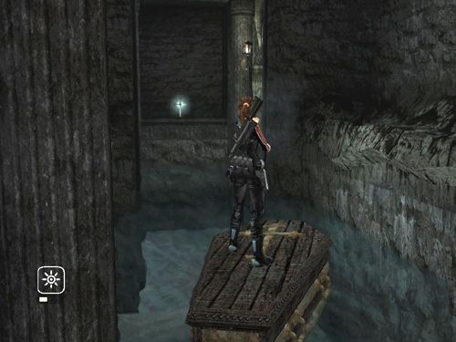 Get on top of the coffin again and float along with the current to the intersection near the metal gate where the water is flowing out of this area. (You can grapple the wall sconce and pull to go faster if you like.)