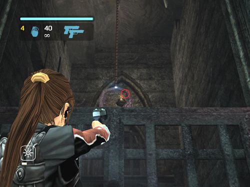 Shoot the shiny ring at the top center of the gate to free the chain.