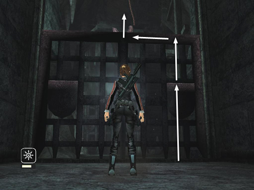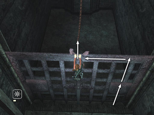 Use either of the decorative shields mounted on the sides of the gate to climb up and grab the top edge. Traverse to the center and jump straight up to grab the chain.