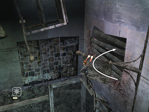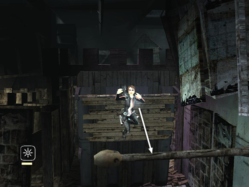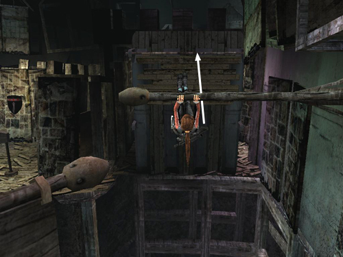 From the horizontal pole on the back wall, swing and jump to grab the top of the wooden door ahead. (It's easy to miss this particular grab and end up hanging by one hand. If that happens, don't forget to press Interact to do a saving grab.)