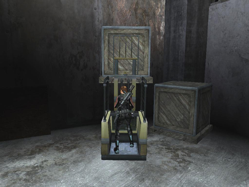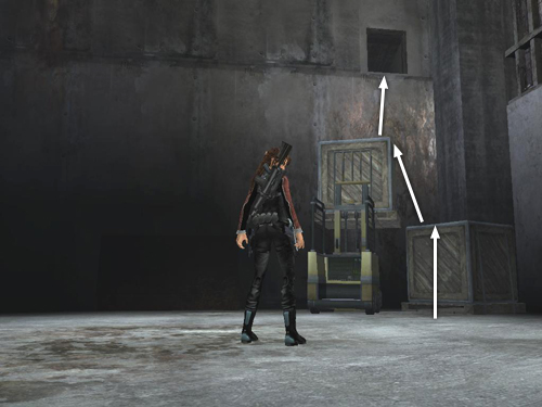 Use the forklift to move one of the stacked crates into the corner beneath the grate. (The main walkthrough covers the forklift controls.) It doesn't need to be positioned too precisely. Now use the forklift to pick up another crate. Maneuver the forklift so the crate it's holding is directly beneath the grate. Raise the fork to its highest position. Then step off.