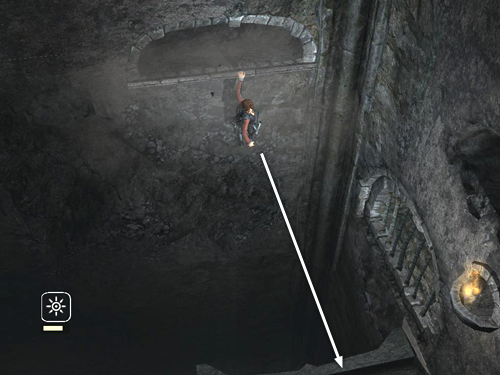 Climb down a bit, adjust Lara's angle, then swing and jump to the broken stairs in the middle of the far wall. The stairs begin to collapse, so quickly turn right and take a running jump to the solid landing in the corner.