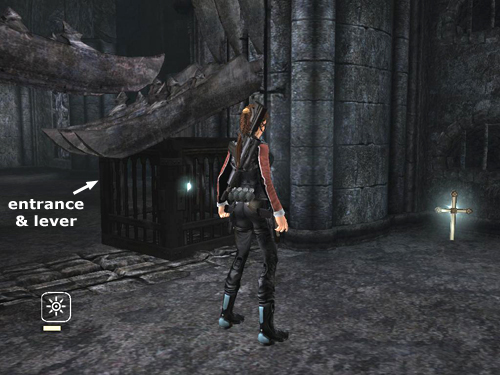 Use either metal box to halt the blades in the doorway on the left (i.e., nearest the lever and on the left when Lara's back is to the open gate).