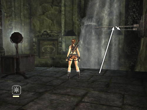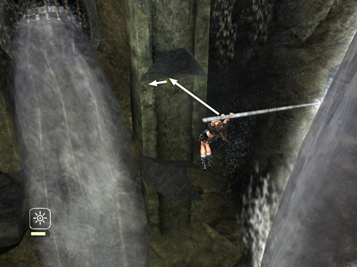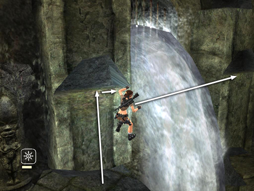 Then return to the handhold above the small step. Climb to the right and jump past the cascade to grab the corner pillar. Continue climbing as described in the main walkthrough.