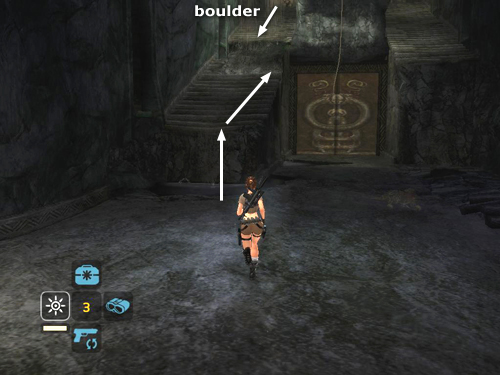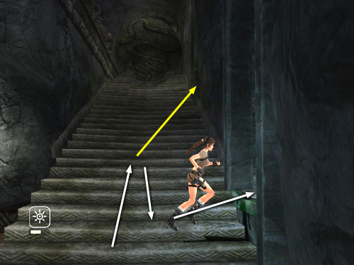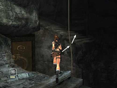 Run up the stairs just a short way to trigger a third boulder. As soon as you hear the rumbling or see the screen start to shake, either run down the stairs into the small alcove (as indicated by the white arrows in the screenshot above), or keep running up the stairs and duck into the alcove ahead on the right (yellow arrow). You could also jump back to the rope, or just run off the edge near the rope. Once the boulder passes, continue up the flight of stairs on the right.