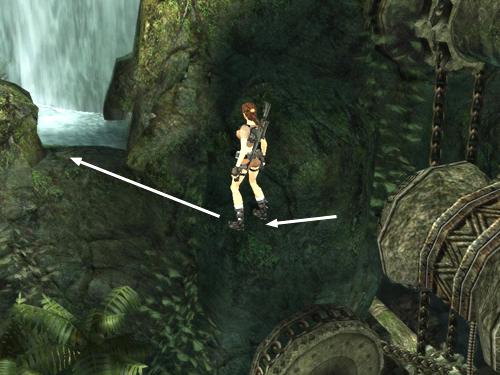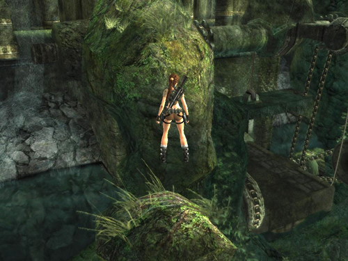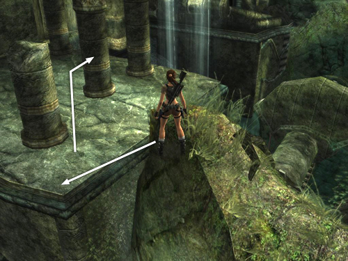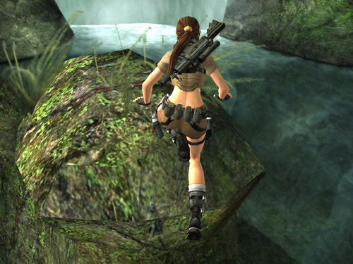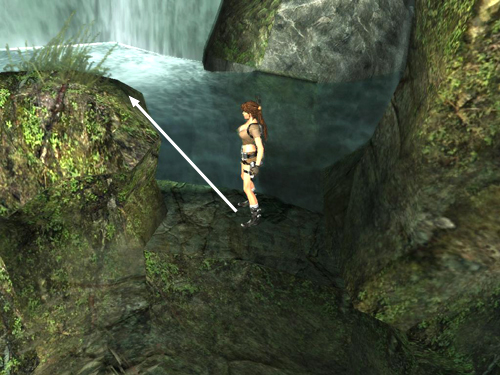 Jump from here to the taller rock formation. Aim for the flat, lighter green area at the middle right, as shown above. Move to the top left side of the taller rock. Again, the actual surface of the rock doesn't match the visual outlines, so until you learn where the edges are, move forward gradually so Lara doesn't fall.