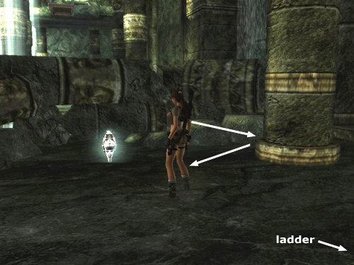Cross the dark area between the ledges. It's safe to climb down, or you can just cross the ledge with the square column near the wall. Jump onto the ledge on the other side and run through the fallen column.