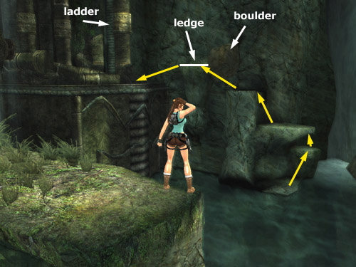 When you complete the level in the normal way, this boulder is dislodged by the rolling boulder from the interactive cut scene. After this, you can climb these ledges to get back and forth from the pool to the temple without any trouble.