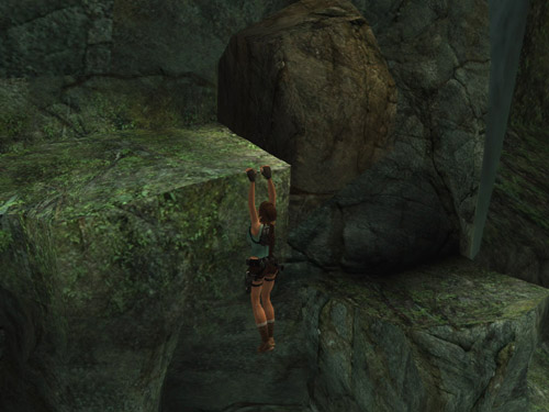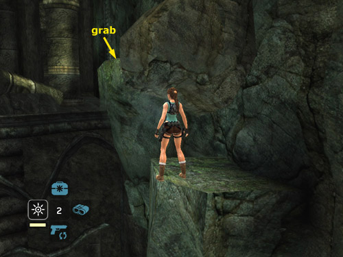 This is the approximate starting position for the jump. Note how the ledge comes to a slight point on the left side. Line Lara up as shown in the screenshot above, so her left foot is at the edge of the ledge, not quite all the way toward the back. Then run forward and jump off between the point and the front corner of the ledge. If you run at just the right angle, Lara will actually take off from a point slightly beyond the edge of the ledge, jump past the boulder without running into it, and grab the ledge beyond. Releasing Forward and continuing to hold Jump after takeoff seems to help, as does not trying to steer to the right in mid-air.