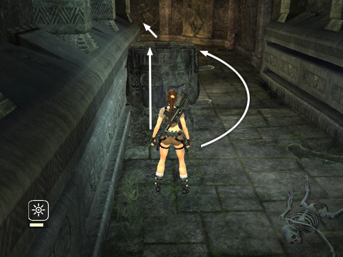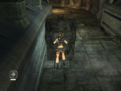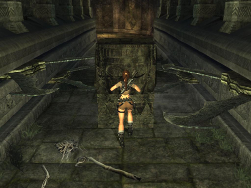 Then push it ahead of Lara through the blades. One way involves pushing the block straight down the center of the passageway (as shown above). Try to keep the block moving straight forward. Don't stop pushing or the blades may knock the block off center, allowing Lara to get sliced.