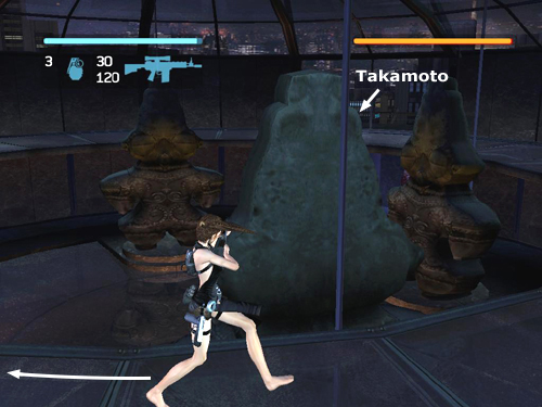 Firing continuously while running to the next statue and back should use up about one clip of ammo. Release the target lock button as you wait behind the statue so Lara will reload. Then repeat the process. If Takamoto moves, run to the statue opposite where he ends up and start the process again. Repeat this until he is dead. He will continue to fire energy blasts at Lara as she runs, but as long as you keep moving, Lara should lose very little health. (Thanks to Anton B. for this tip.) [Aggro Strategy | Part 2 | Return to Japan Walkthrough] Copyright © 2006- - Stellalune (). All rights reserved. The screenshots and videos included here were made using Fraps. Feel free to copy or print this walkthrough for personal use. By all means, share it with friends, but please include this credit line so people can send me their feedback. No part of this walkthrough may be reproduced on another site without permission. Follow this link for details about this site's advertising and privacy policy. |