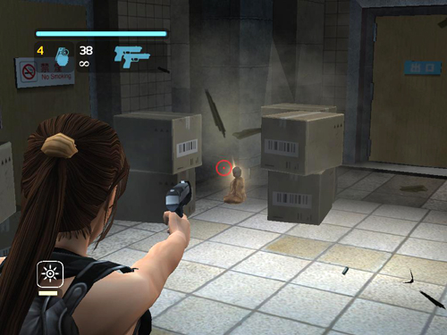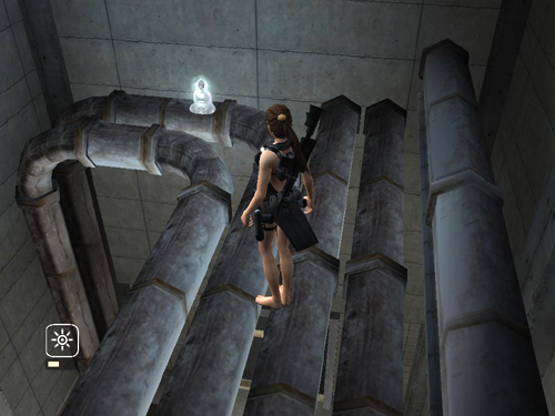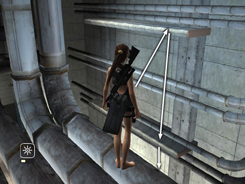Then jump back onto the pipes behind Lara. Shoot the small crate. . .