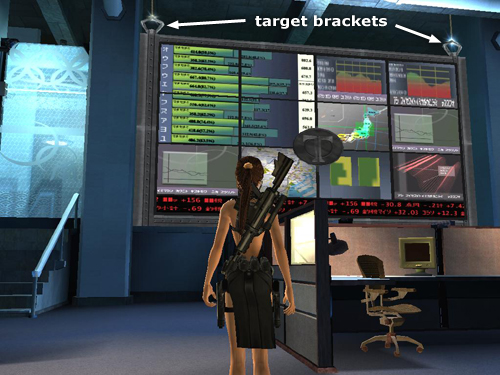 In order to create a way out of this room, you'll need to shoot the shiny brackets at the top left and right corners of the huge news display screen.