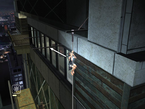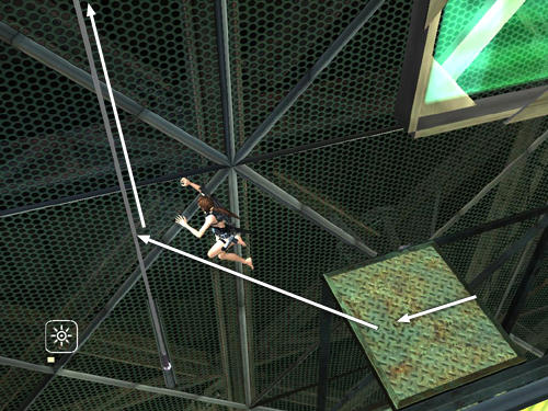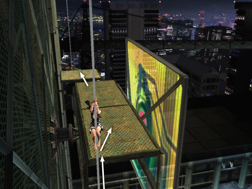Then when Lara does reach the top, the horizontal bars will be directly behind her, and the camera will be pointing toward them. When Zip shouts a warning over the headset, immediately press Jump, without any direction keys or movement on the control stick, and Lara should jump back. . .