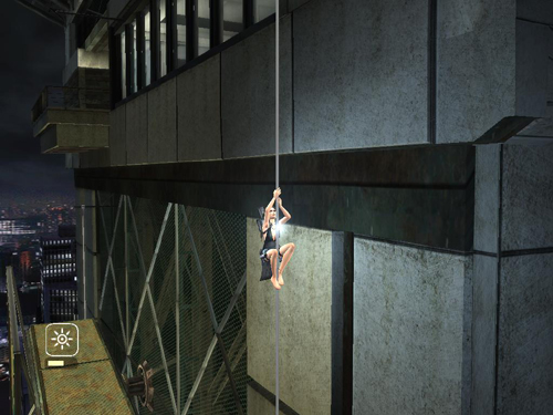 Move to the edge of the ledge and jump to grab the long, skinny vertical pole close to the side of the building. Here Alister begs Lara not to look down. (Bet you did anyway.)