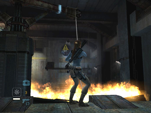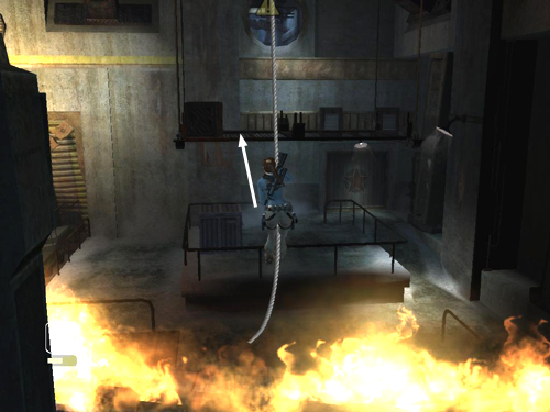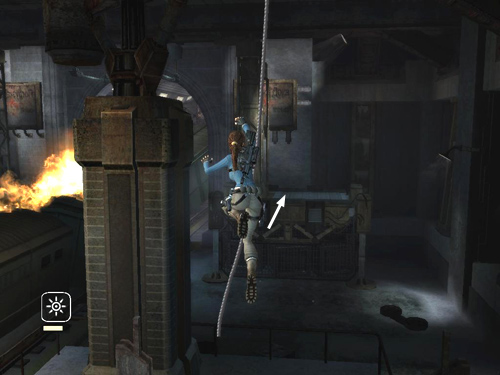 Climb up the rope a little if necessary so Lara doesn't get singed by the flames. Then swing and jump to the next platform.