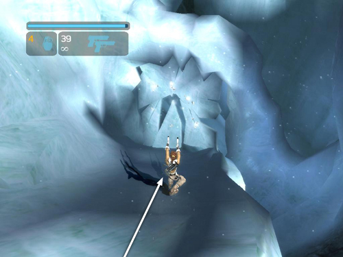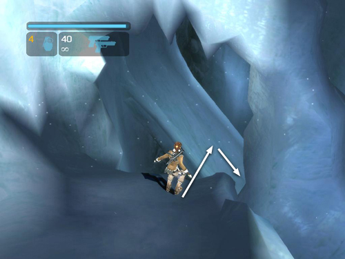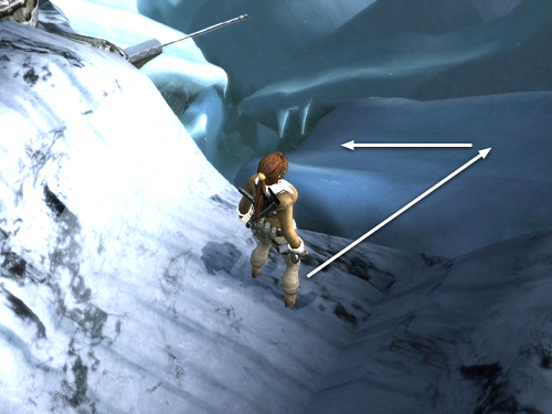 Jump from the end of the trench across the chasm and onto the icy slope ahead, which slants down to the left.