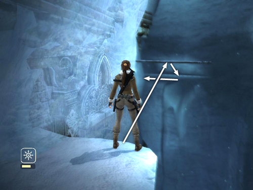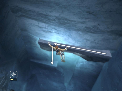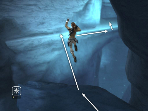 Immediately take a running jump to grab the horizontal handhold on the wall ahead. Traverse to the right and pull up on a narrow ledge made of ice.