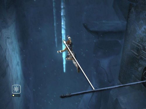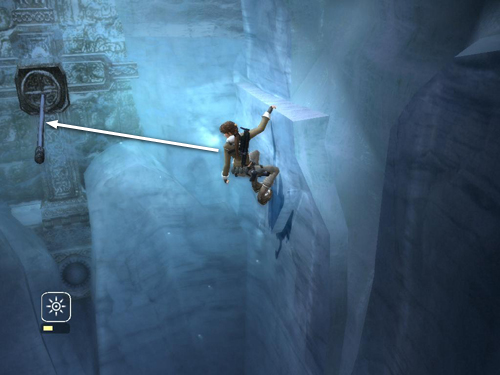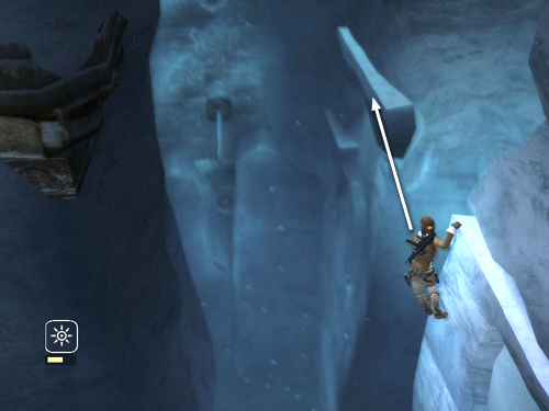 Turn right and jump to grab the horizontal pole. (Don't worry. This one doesn't break.) Swing around and jump to grab the light-colored ice shelf on the wall ahead. Climb to the left.