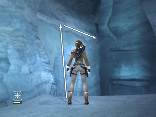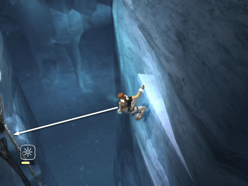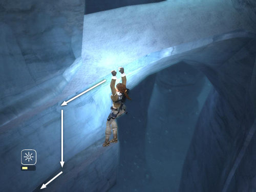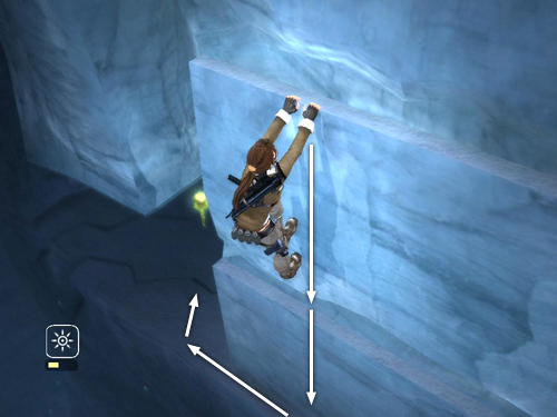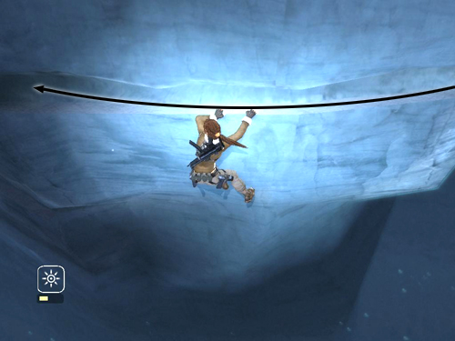 Then jump to grab a break-away ledge on the wall way off to the right. Traverse quickly to the right (tap Interact to go faster) and jump straight up to grab the ledge above before your handhold collapses completely. Pull up into the opening.