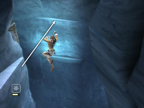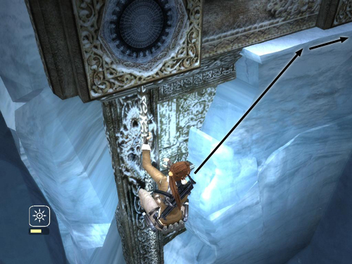 Then leap across the gap to grab a handhold on the wall to the right. (At this point you can drop down to the ledge below, but it's not necessary.)