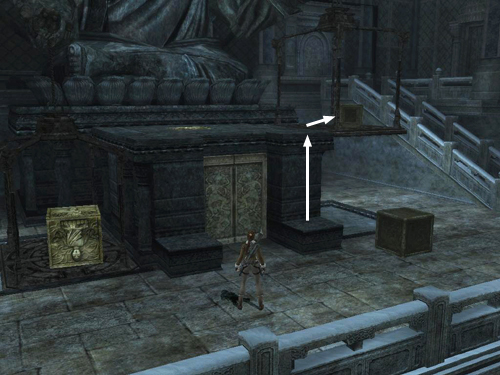 First, face the statue and climb onto the scale platform on the right, as indicated by the arrow in the screenshot above.