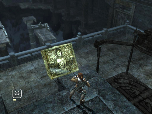 Instead of going through the elaborate process of solving the balance puzzle, as shown in the previous set of screenshots, Lara can grapple the golden block up onto the ledge. This takes a little finesse, but if you practice it first, it can save precious seconds during a time trial.