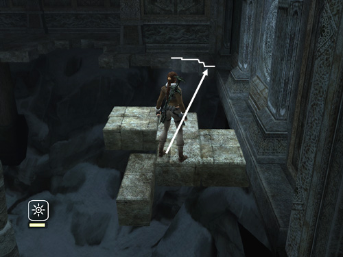 After landing on the corner ledge, go to the left. Watch out for the gap in the floor (indicated in the screenshot above). If you move quickly and stay near the wall, you can cross over it without falling. Or, jump over the gap but take care not to overshoot the ledge ahead. Then turn right and jump across another gap in the floor. After you've cleared the second gap, go forward toward the wall and then turn left and follow the balcony to the end.