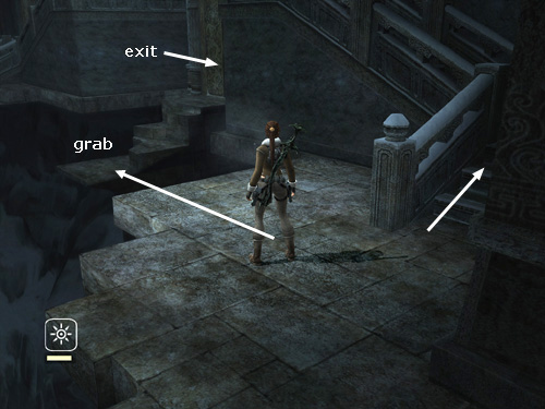 There you'll see stairs leading up toward the entrance and the small, square ledge you were originally aiming for. This is located just below the exit. Now you can either take a running jump from the edge of the balcony to grab that ledge. OR, go up the stairs to the entrance.