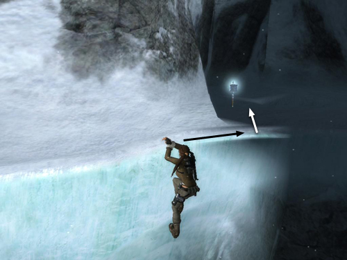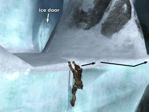 There's an open area here where you could pull up and go forward, but don't do that yet. Instead keep climbing along the ledge to the right.